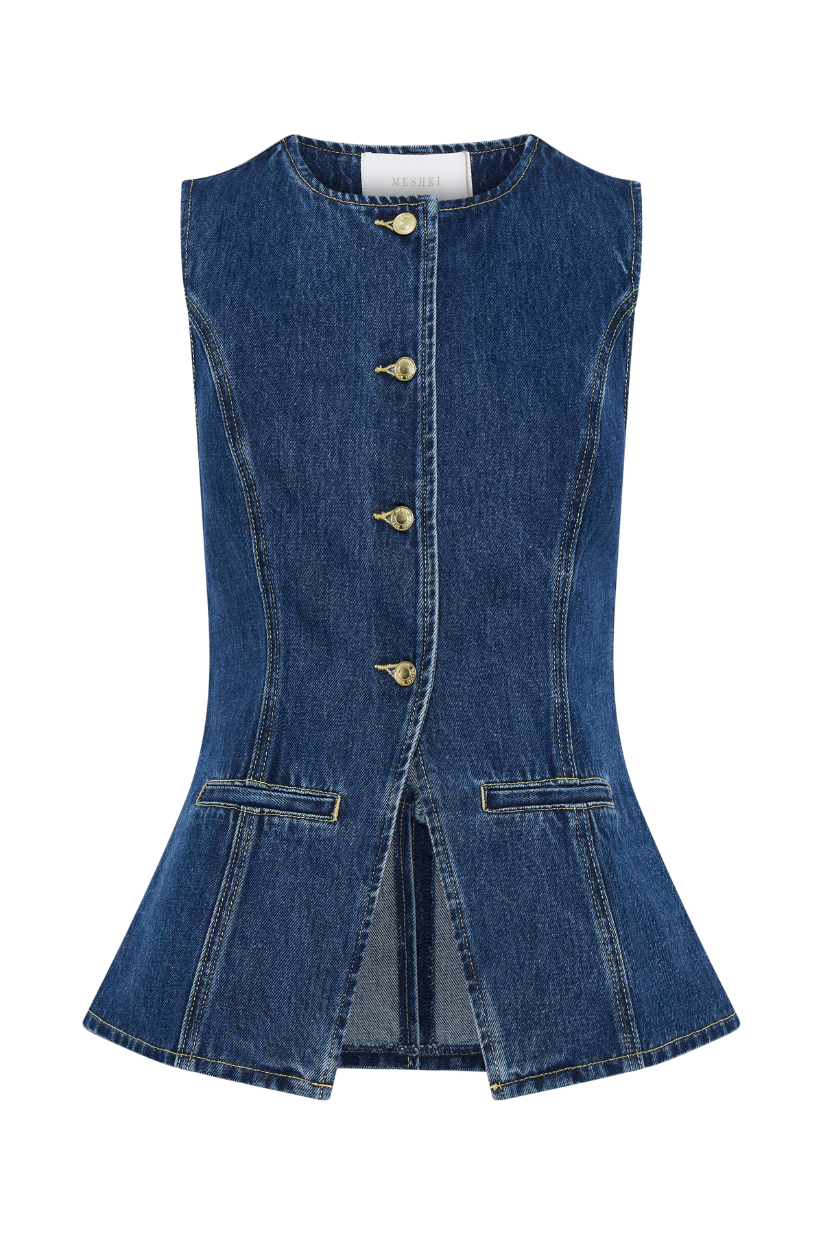 This women's denim set combines a clean cut with fashionable details. The sleeveless top with button placket and structured seams creates an elegant silhouette, while the matching shorts complete the look. Ideal for casual outfits or trendy street style moments.